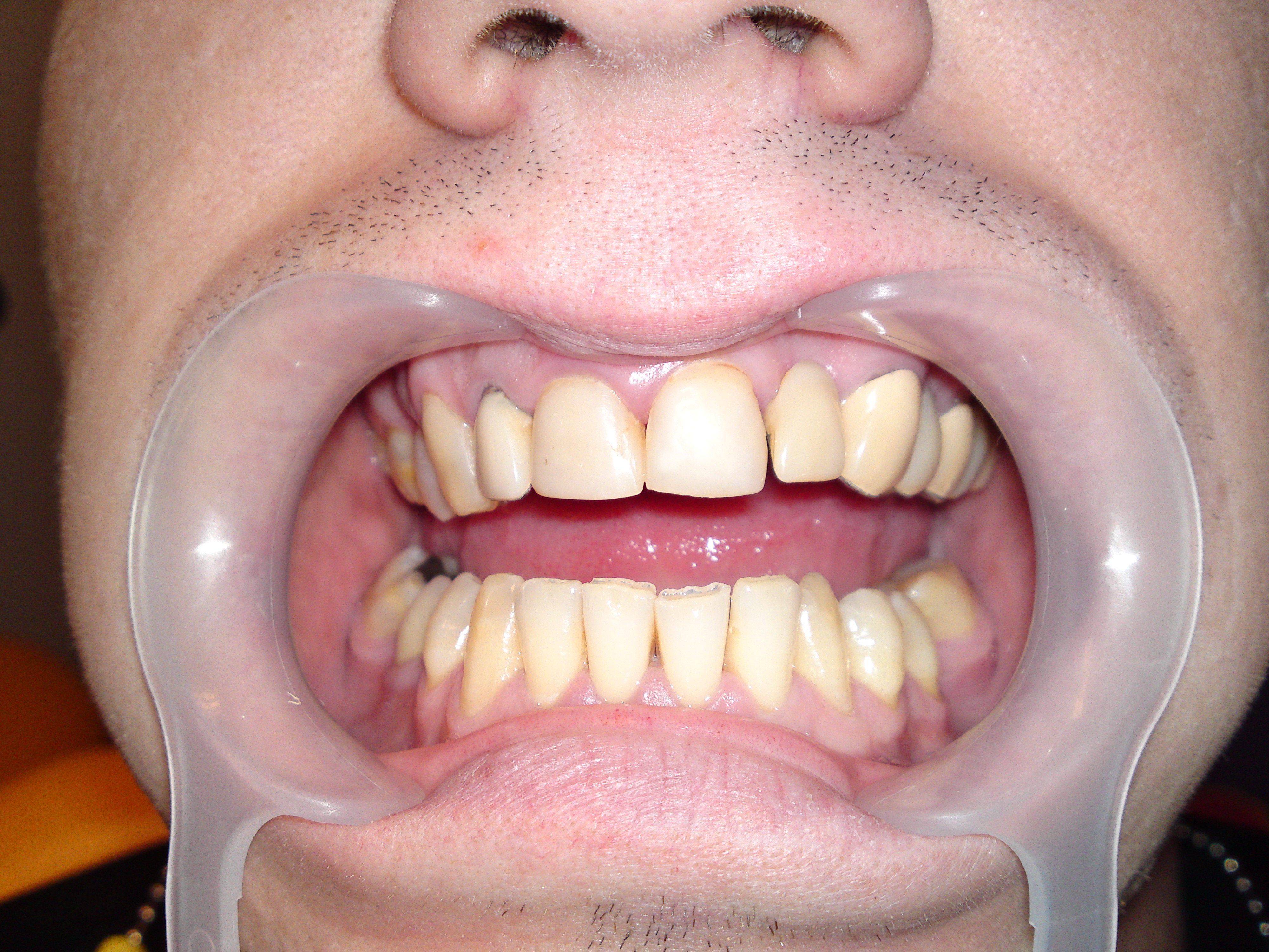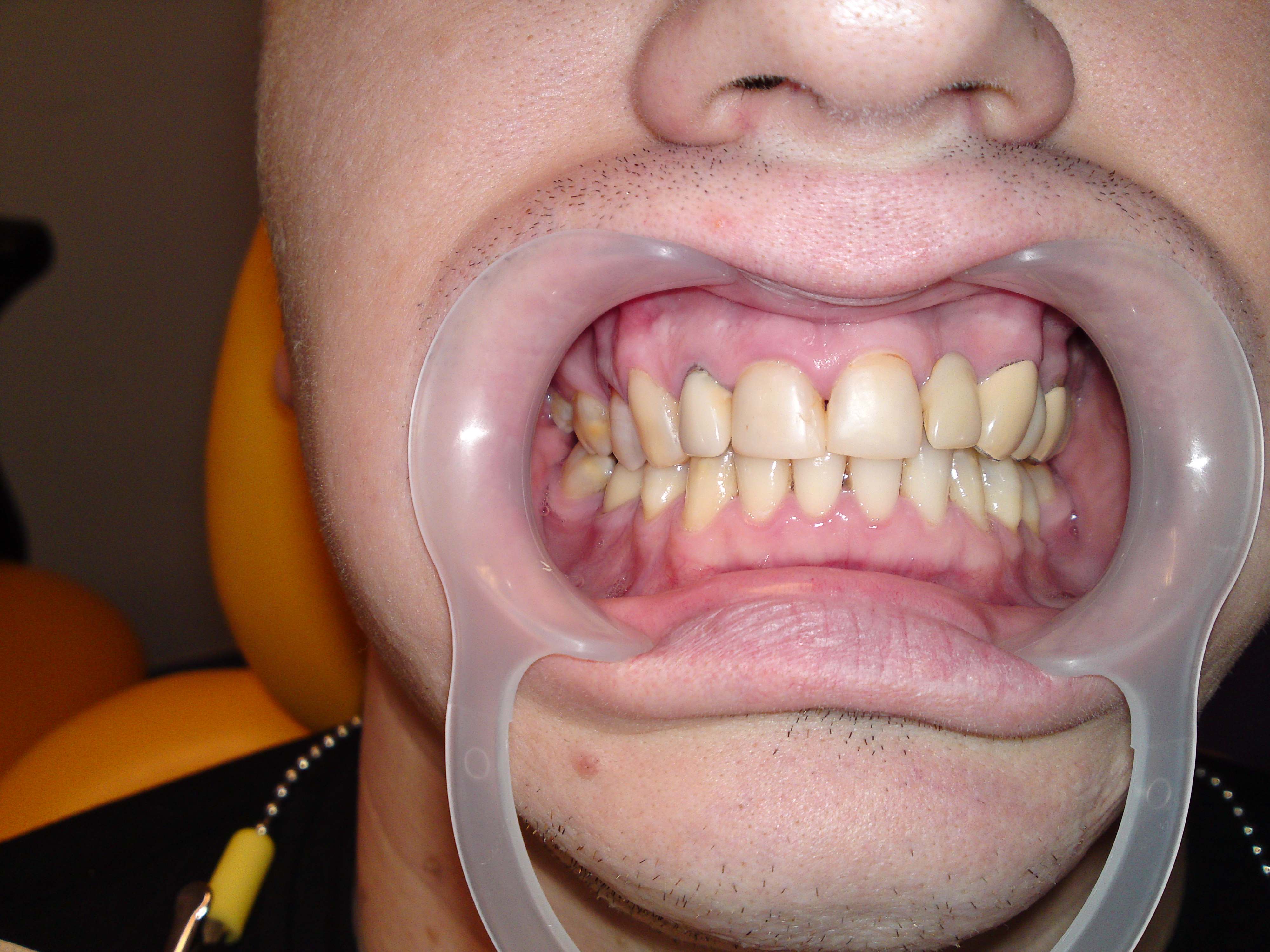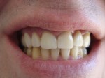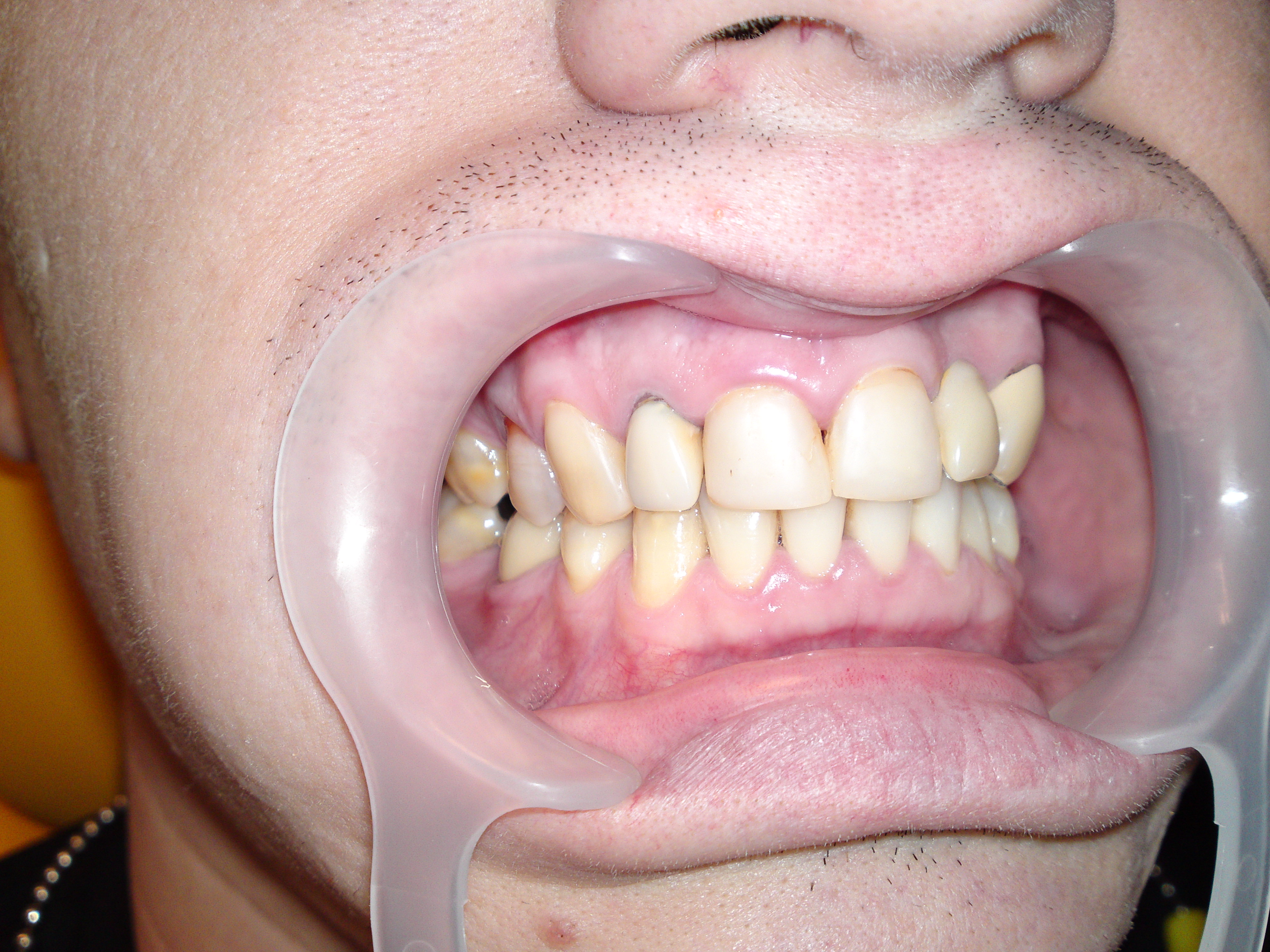 STATUSUL INITIAL – Pacientul prezenta urmatoarele: edentatie partiala in zona laterala a cadranului 1, carie profunda -1.6, carie, aspectul tern, gri al premolarului superior devital-1.4, lucrari protetice fixe acrilice vechi, neadaptate marginal, fatete din compozit pe incisivii frontali superiori.
