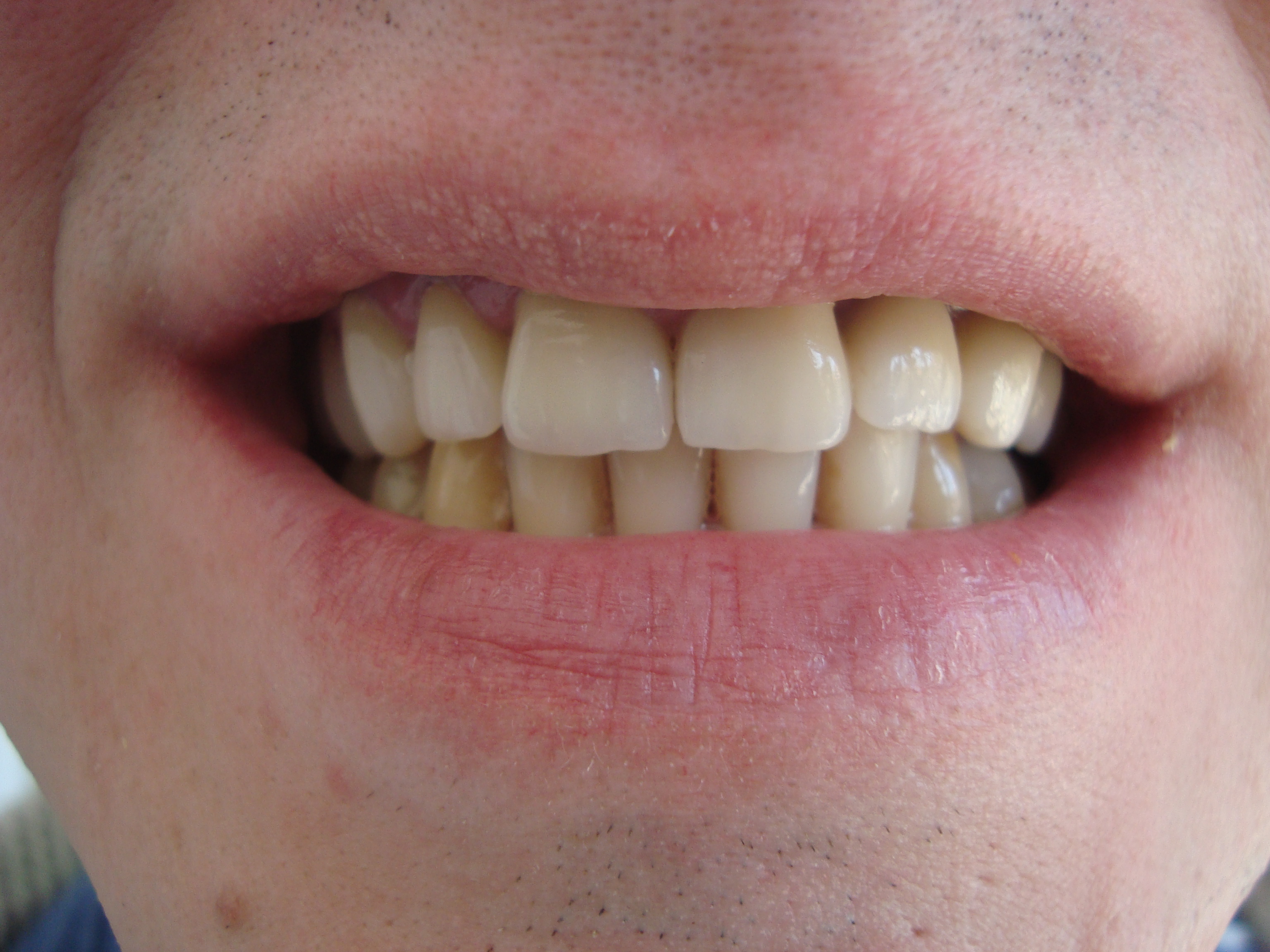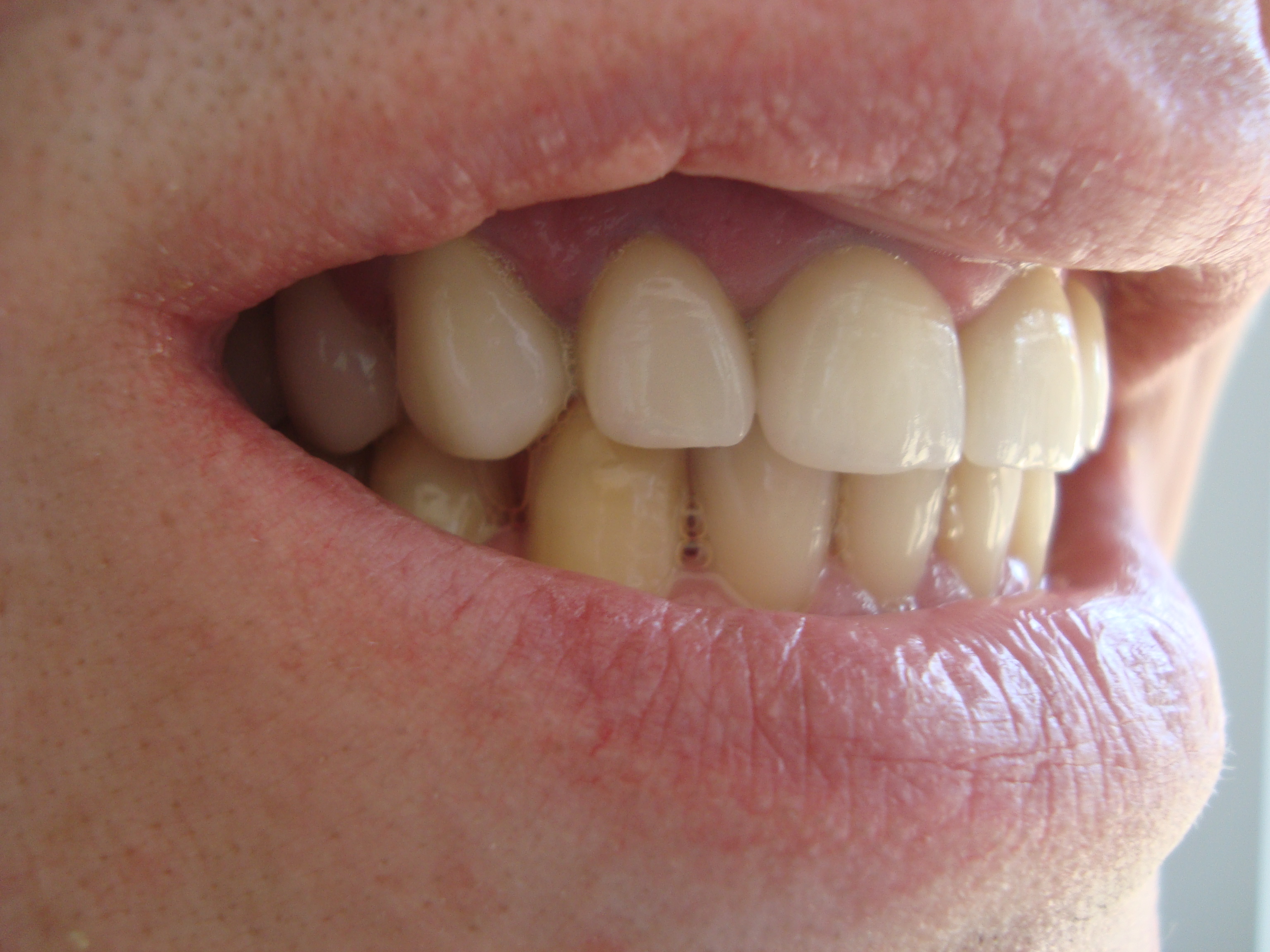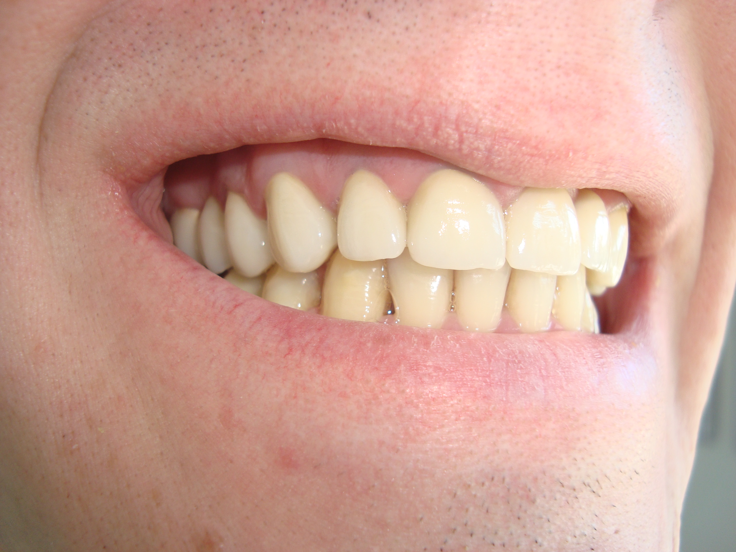 STATUSUL INITIAL – Pacientul prezenta urmatoarele: edentatie partiala in zona laterala a cadranului 1, carie profunda -1.6, carie, aspectul tern, gri al premolarului superior devital-1.4, lucrari protetice fixe acrilice vechi, neadaptate marginal, fatete din compozit pe incisivii frontali superiori.